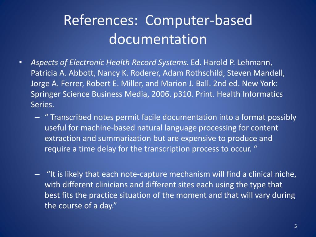 References: Computer-based documentation • Aspects of Electronic Health Record Systems. Ed. Harold P. Lehmann, Patricia A. Abbott, Nancy K. Roderer, Adam Rothschild, Steven Mandell, Jorge A. Ferrer, Robert E. Miller, and Marion J. Ball. 2nd ed. New York: Springer Science Business Media, 2006. p310. Print. Health Informatics Series. • “ Transcribed notes permit facile documentation into a format possibly useful for machine-based natural language processing for content extraction and summarization but are expensive to produce and require a time delay for the transcription process to occur. “ • “It is likely that each note-capture mechanism will find a clinical niche, with different clinicians and different sites each using the type that best fits the practice situation of the moment and that will vary during the course of a day.”
