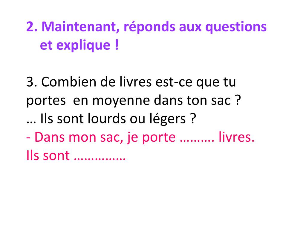 2. Maintenant, réponds aux questions et explique ! 3. Combien de livres est-ce que tu portes en moyenne dans ton sac ? … Ils sont lourds ou légers ? ……………………………………………………………