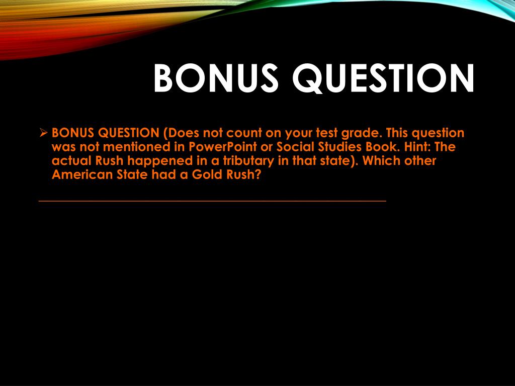 BONUS QUESTION • BONUS QUESTION (Does not count on your test grade. This question was not mentioned in PowerPoint or Social Studies Book. Hint: The actual Rush happened in a tributary in that state). Which other American State had a Gold Rush? ______________________________________________________