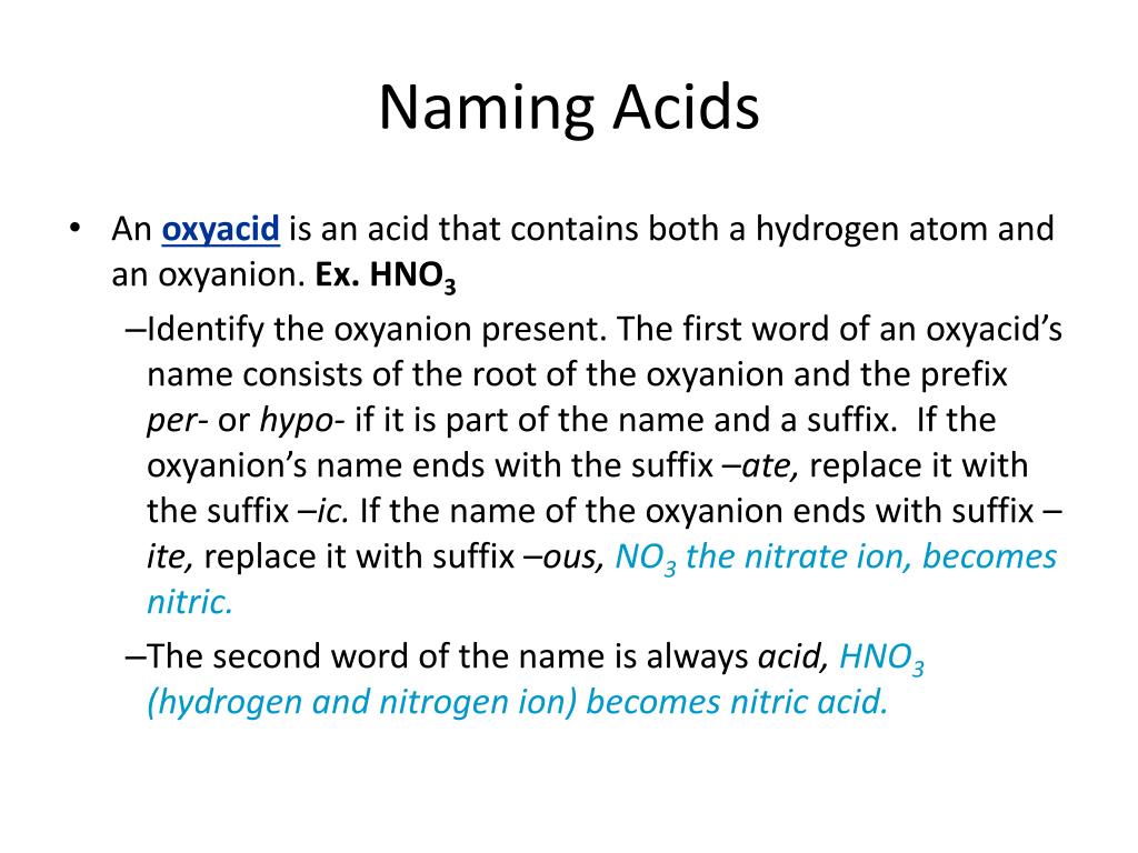 Naming Acids • An oxyacid is an acid that contains both a hydrogen atom and an oxyanion. Ex. HNO3 • Identify the oxyanion present. The first word of an oxyacid’s name consists of the root of the oxyanion and the prefix per- or hypo- if it is part of the name and a suffix. If the oxyanion’s name ends with the suffix –ate, replace it with the suffix –ic. If the name of the oxyanion ends with suffix –ite, replace it with suffix –ous, NO3 the nitrate ion, becomes nitric. • The second word of the name is always acid, HNO3 (hydrogen and nitrogen ion) becomes nitric acid.