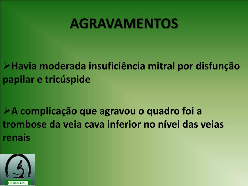 AGRAVAMENTOS Havia moderada insuficiência mitral por disfunção papilar e tricúspide A complicação que agravou o quadro foi a trombose da veia cava inferior no nível das veias renais