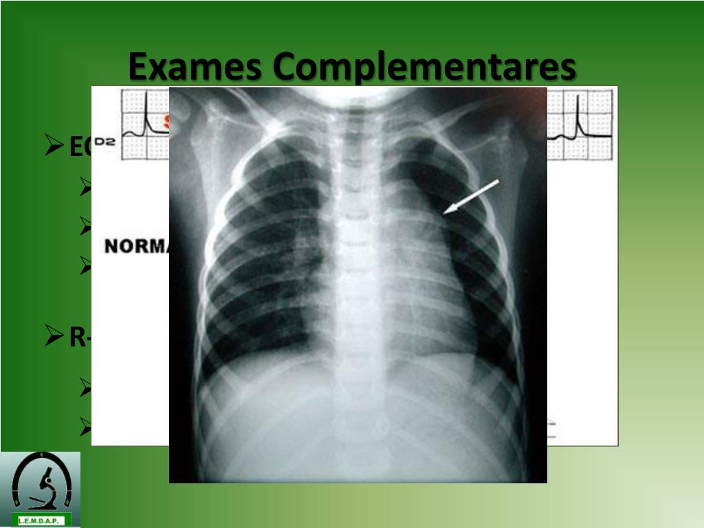 Exames Complementares • ECG • Sobrecarga atrial D • Alteração da repolarização ventricular • Retificação do segmento ST • R-X • Aumento área cardíaca • Abaulamento arco médio