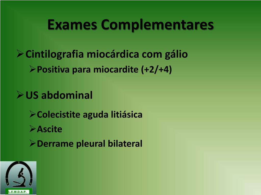 Exames Complementares • Cintilografia miocárdica com gálio • Positiva para miocardite (+2/+4) • US abdominal • Colecistite aguda litiásica • Ascite • Derrame pleural bilateral