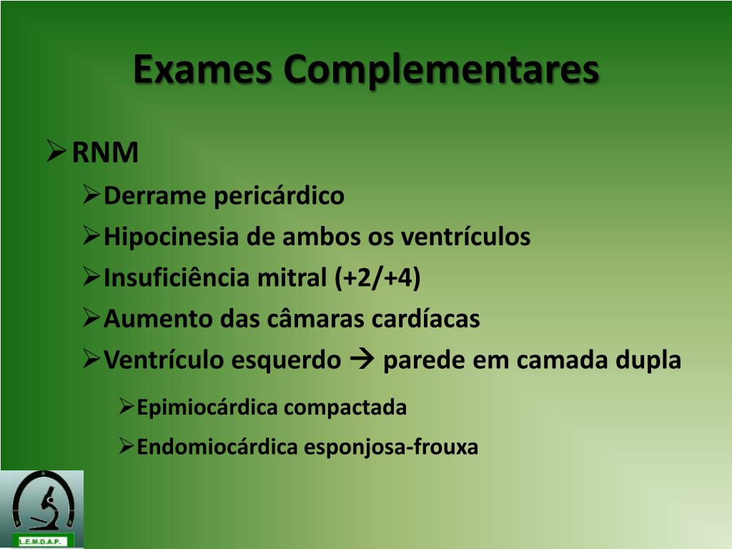 Exames Complementares • RNM • Derrame pericárdico • Hipocinesia de ambos os ventrículos • Insuficiência mitral (+2/+4) • Aumento das câmaras cardíacas • Ventrículo esquerdo parede em camada dupla • Epimiocárdica compactada • Endomiocárdica esponjosa-frouxa