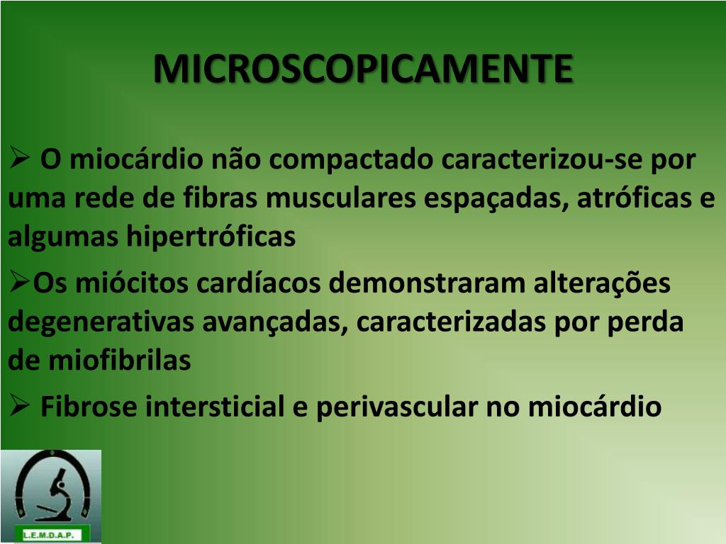 MICROSCOPICAMENTE O miocárdio não compactado caracterizou-se por uma rede de fibras musculares espaçadas, atróficas e algumas hipertróficas Os miócitos cardíacos demonstraram alterações degenerativas avançadas, caracterizadas por perda de miofibrilas Fibrose intersticial e perivascular no miocárdio