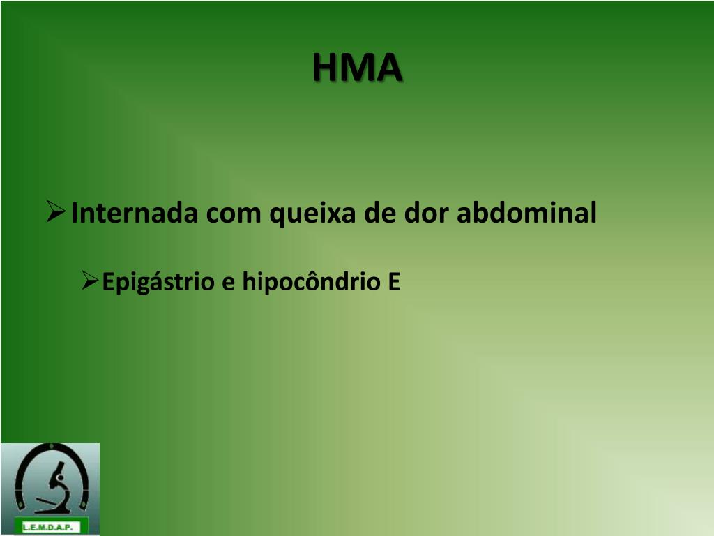HMA • Internada com queixa de dor abdominal • Epigástrio e hipocôndrio E