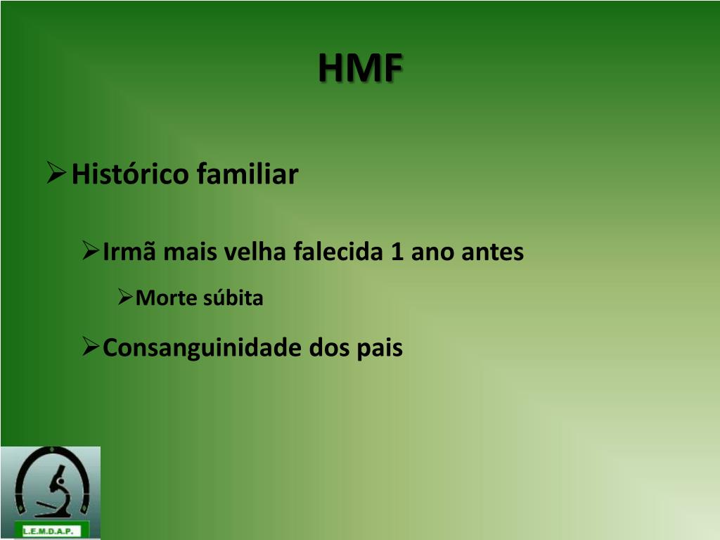 HMF • Histórico familiar • Irmã mais velha falecida 1 ano antes • Morte súbita • Consanguinidade dos pais