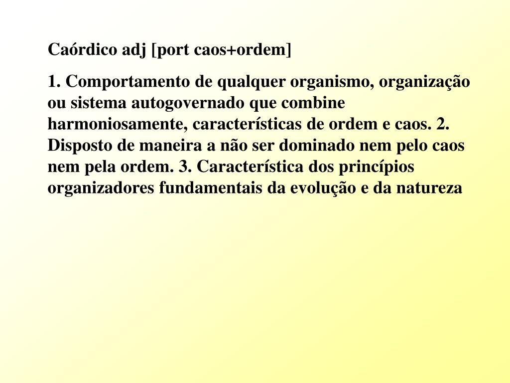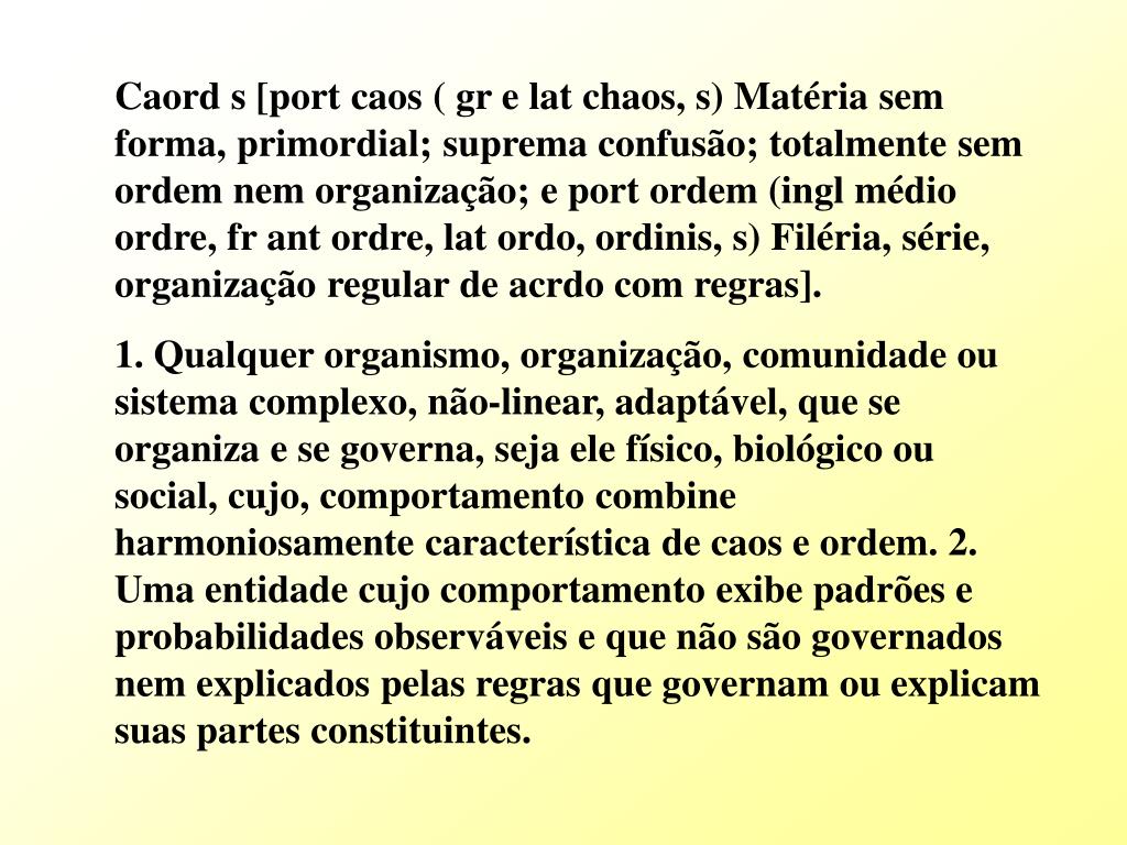 Caord s [port caos ( gr e lat chaos, s) Matéria sem forma, primordial; suprema confusão; totalmente sem ordem nem organização; e port ordem (ingl médio ordre, fr ant ordre, lat ordo, ordinis, s) Filéria, série, organização regular de acrdo com regras]. 1. Qualquer organismo, organização, comunidade ou sistema complexo, não-linear, adaptável, que se organiza e se governa, seja ele físico, biológico ou social, cujo, comportamento combine harmoniosamente característica de caos e ordem. 2. Uma entidade cujo comportamento exibe padrões e probabilidades observáveis e que não são governados nem explicados pelas regras que governam ou explicam suas partes constituintes.