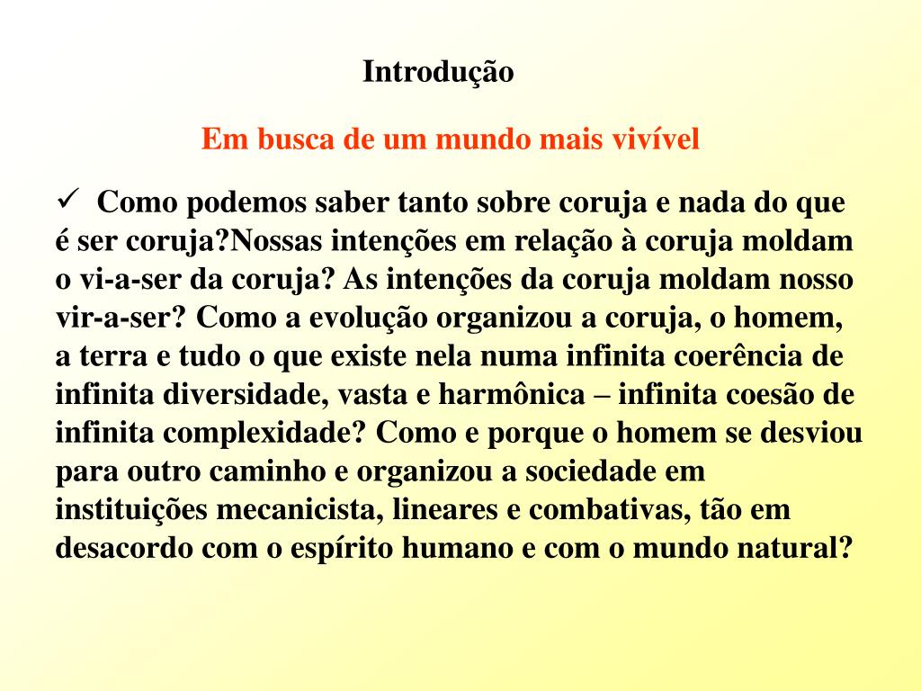 Introdução Em busca de um mundo mais vivível • Como podemos saber tanto sobre coruja e nada do que é ser coruja?Nossas intenções em relação à coruja moldam o vi-a-ser da coruja? As intenções da coruja moldam nosso vir-a-ser? Como a evolução organizou a coruja, o homem, a terra e tudo o que existe nela numa infinita coerência de infinita diversidade, vasta e harmônica – infinita coesão de infinita complexidade? Como e porque o homem se desviou para outro caminho e organizou a sociedade em instituições mecanicista, lineares e combativas, tão em desacordo com o espírito humano e com o mundo natural?