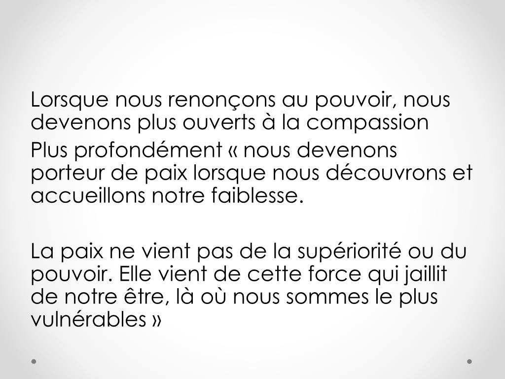 Lorsque nous renonçons au pouvoir, nous devenons plus ouverts à la compassion Plus profondément « nous devenons porteur de paix lorsque nous découvrons et accueillons notre faiblesse. La paix ne vient pas de la supériorité ou du pouvoir. Elle vient de cette force qui jaillit de notre être, là où nous sommes le plus vulnérables »