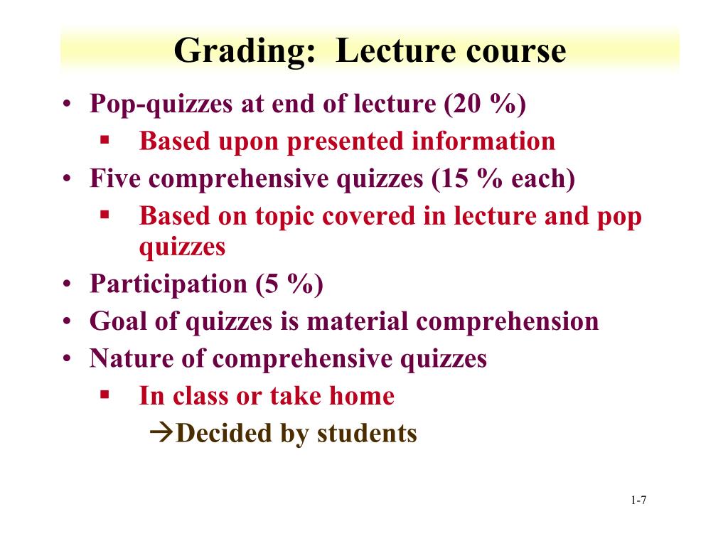 Grading: Lecture course • Pop-quizzes at end of lecture (20 %) • Based upon presented information • Five comprehensive quizzes (15 % each) • Based on topic covered in lecture and pop quizzes • Participation (5 %) • Goal of quizzes is material comprehension • Nature of comprehensive quizzes • In class or take home • Decided by students