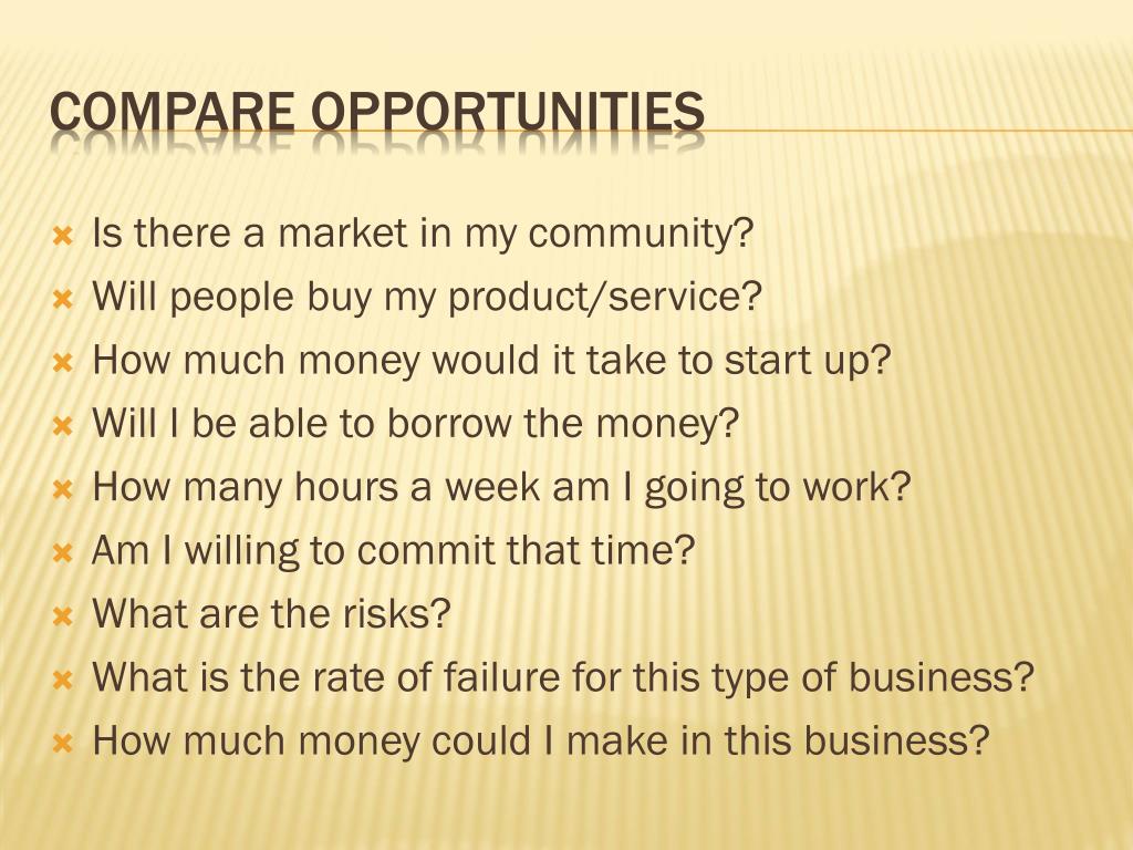 Compare Opportunities • Is there a market in my community? • Will people buy my product/service? • How much money would it take to start up? • Will I be able to borrow the money? • How many hours a week am I going to work? • Am I willing to commit that time? • What are the risks? • What is the rate of failure for this type of business? • How much money could I make in this business?