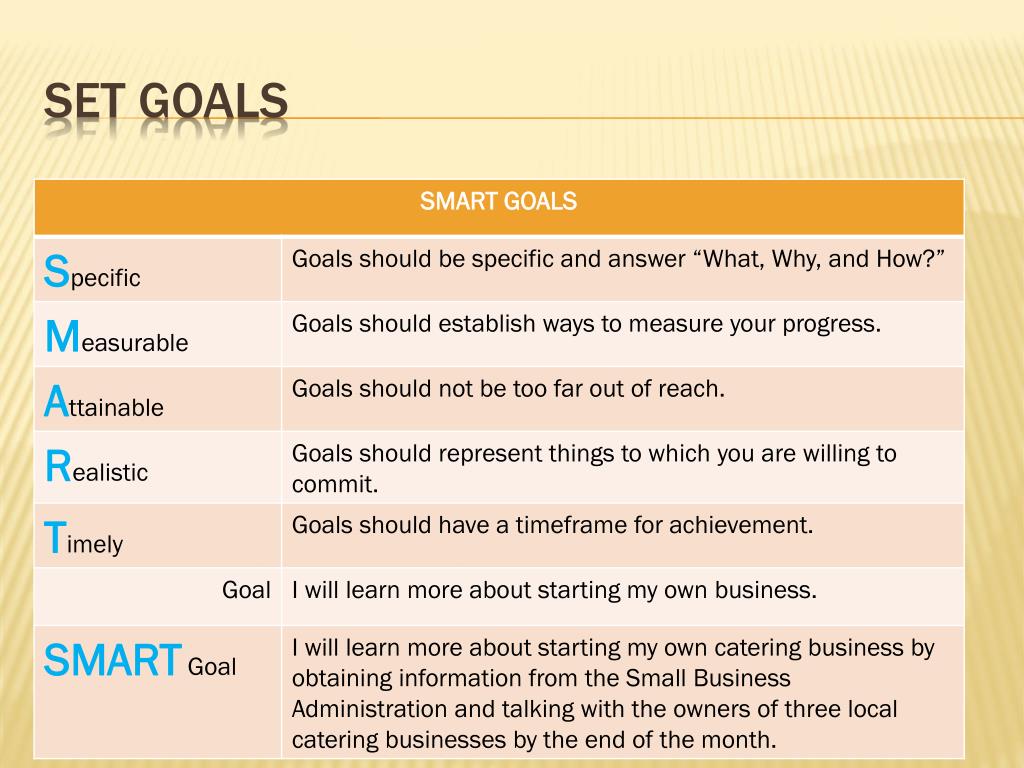 Financial goals • Set before starting business • Realistic • SMART goals are best