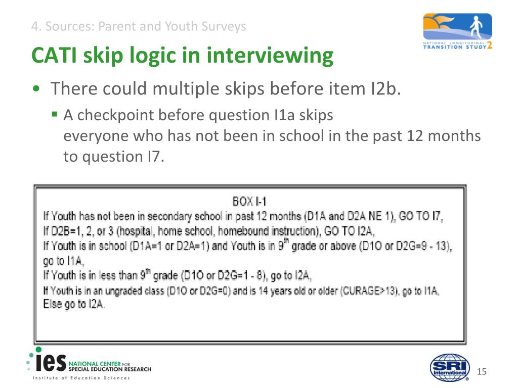 CATI skip logic in interviewing • There could multiple skips before item I2b. • A checkpoint before question I1a skipseveryone who has not been in school in the past 12 months to question I7.