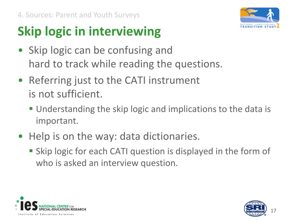 Parent/youth interviews • Skips can be triggered by a predetermined value to a preload item, a specific response or responses to a question, or a logical checkpoint that uses any combination of responses and/or preloaded values. • Skip Instructions are not read aloud to the respondent. • Individual questions in CATI instruments can be easy to understand; the skip implications are not. • Any question may be skipped by one or more logic statements preceding it. • It can be difficult to determine which respondents are included in the data for a given question just by looking at the questionnaire.