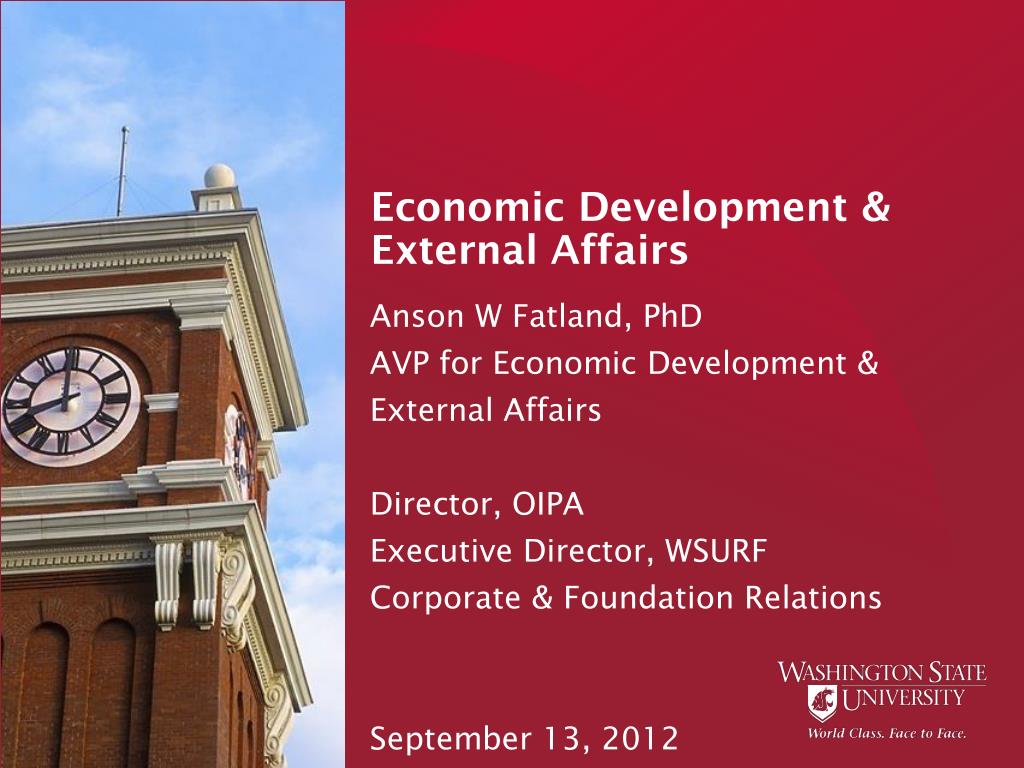 Economic Development & External Affairs. Anson W Fatland, PhD AVP for Economic Development & External Affairs Director, OIPA Executive Director, WSURF Corporate & Foundation Relations September 13, 2012. Focused on aligning WSU strengths with economic activity.