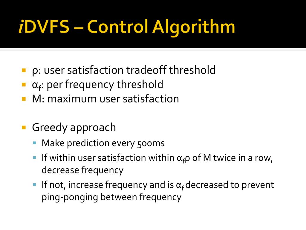 iDVFS – Control Algorithm • ρ: user satisfaction tradeoff threshold • αf: per frequency threshold • M: maximum user satisfaction • Greedy approach • Make prediction every 500ms • If within user satisfaction within αfρ of M twice in a row, decrease frequency • If not, increase frequency and is αf decreased to prevent ping-ponging between frequency
