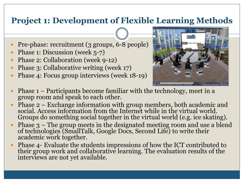 Project 1: DevelopmentofFlexibleLearningMethods • Pre-phase: recruitment (3 groups, 6-8 people) • Phase 1: Discussion (week 5-7) • Phase 2: Collaboration (week 9-12) • Phase 3: Collaborative writing (week 17) • Phase 4: Focus group interviews (week 18-19) • Phase 1 – Participants become familiar with the technology, meet in a group room and speak to each other. • Phase 2 – Exchange information with group members, both academic and social. Access information from the Internet while in the virtual world. Groups do something social together in the virtual world (e.g. ice skating). • Phase 3 – The group meets in the designated meeting room and use a blend of technologies (SmallTalk, Google Docs, Second Life) to write their academic work together. • Phase 4- Evaluate the students impressions of how the ICT contributed to their group work and collaborative learning. The evaluation results of the interviews are not yet available.