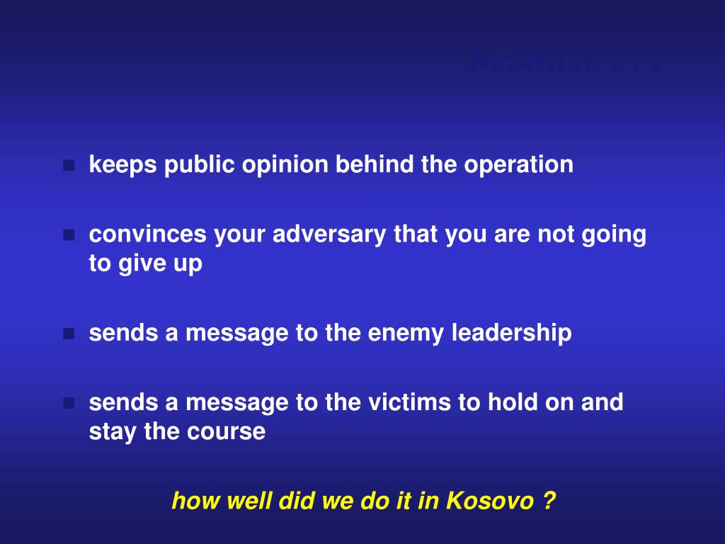 because . . . • keeps public opinion behind the operation • convinces your adversary that you are not going to give up • sends a message to the enemy leadership • sends a message to the victims to hold on and stay the course how well did we do it in Kosovo ?