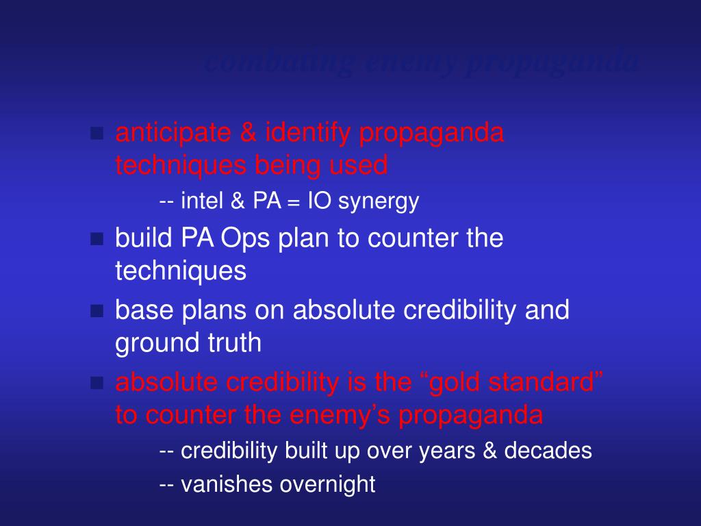 combating enemy propaganda • anticipate & identify propaganda techniques being used -- intel & PA = IO synergy • build PA Ops plan to counter the techniques • base plans on absolute credibility and ground truth • absolute credibility is the “gold standard” to counter the enemy’s propaganda -- credibility built up over years & decades -- vanishes overnight