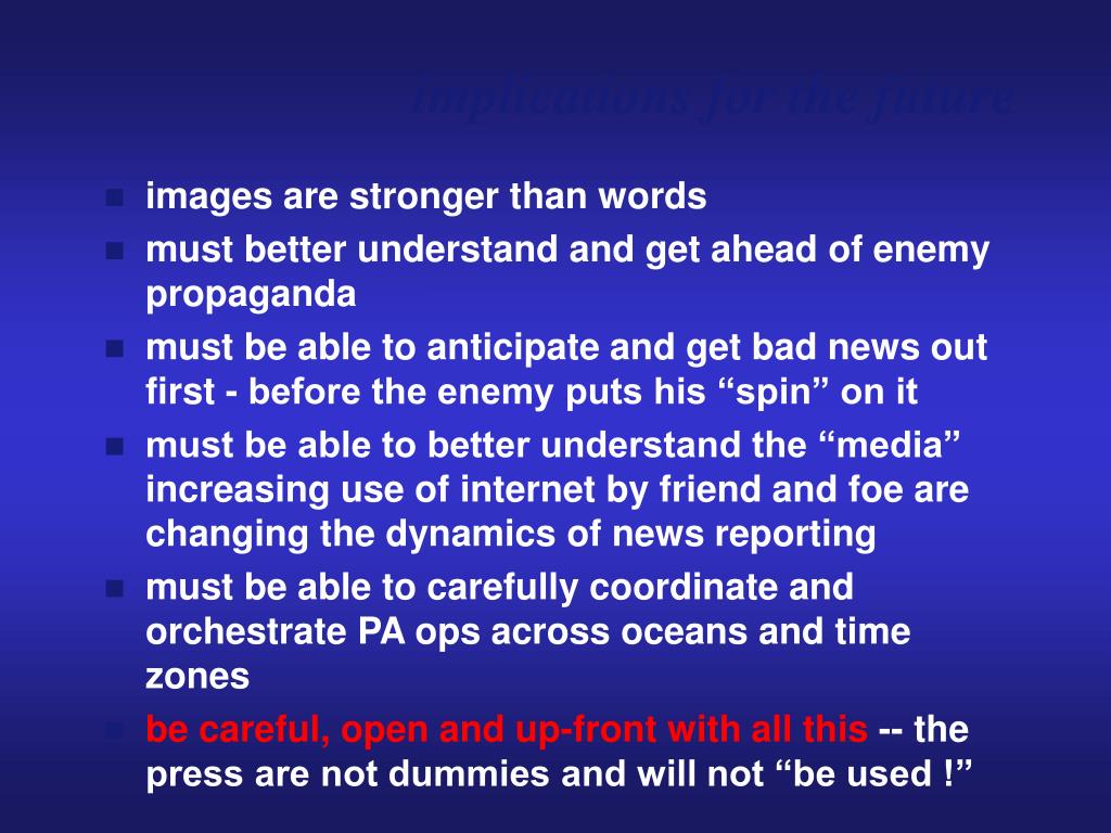 implications for the future • images are stronger than words • must better understand and get ahead of enemy propaganda • must be able to anticipate and get bad news out first - before the enemy puts his “spin” on it • must be able to better understand the “media” increasing use of internet by friend and foe are changing the dynamics of news reporting • must be able to carefully coordinate and orchestrate PA ops across oceans and time zones • be careful, open and up-front with all this -- the press are not dummies and will not “be used !”