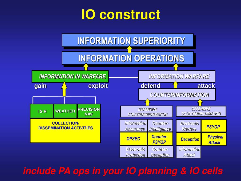 IO construct INFORMATION SUPERIORITY INFORMATION OPERATIONS INFORMATION IN WARFARE INFORMATION WARFARE defend attack gain exploit COUNTERINFORMATION PRECISION NAV OFFENSIVE COUNTERINFORMATION WEATHER I S R DEFENSIVE COUNTERINFORMATION Information Assurance Counter- Intelligence Electronic Warfare COLLECTION/ DISSEMINATION ACTIVITIES PSYOP Counter- PSYOP Physical Attack OPSEC Deception Electronic Protection Counter- Deception Information Attack include PA ops in your IO planning & IO cells
