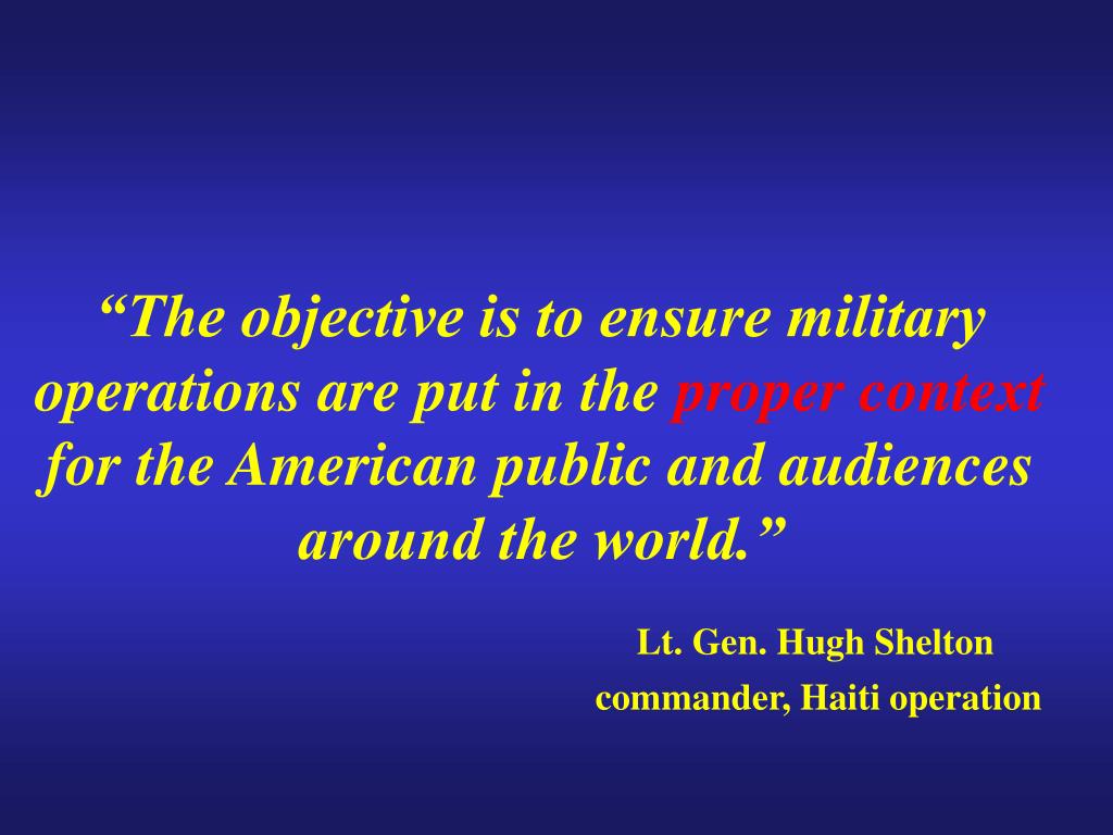 “The objective is to ensure military operations are put in the proper context for the American public and audiences around the world.” Lt. Gen. Hugh Shelton commander, Haiti operation