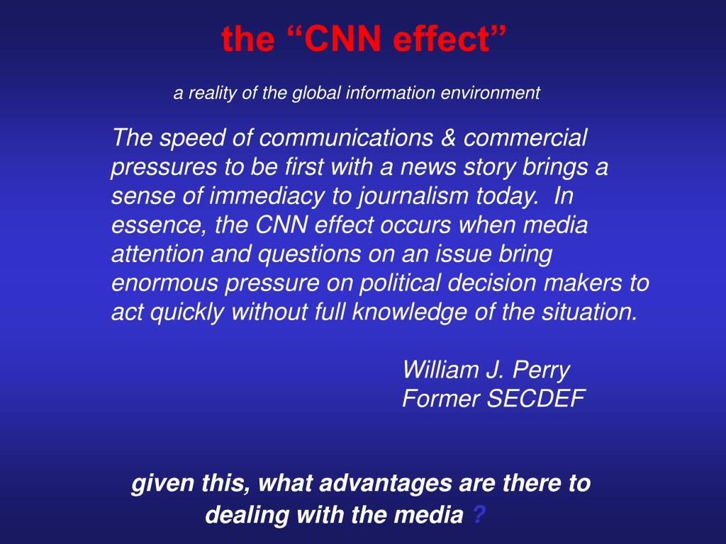 the “CNN effect”a reality of the global information environmentThe speed of communications & commercial pressures to be first with a news story brings a sense of immediacy to journalism today. In essence, the CNN effect occurs when media attention and questions on an issue bring enormous pressure on political decision makers to act quickly without full knowledge of the situation. William J. Perry Former SECDEFgiven this, what advantages are there to dealing with the media ?