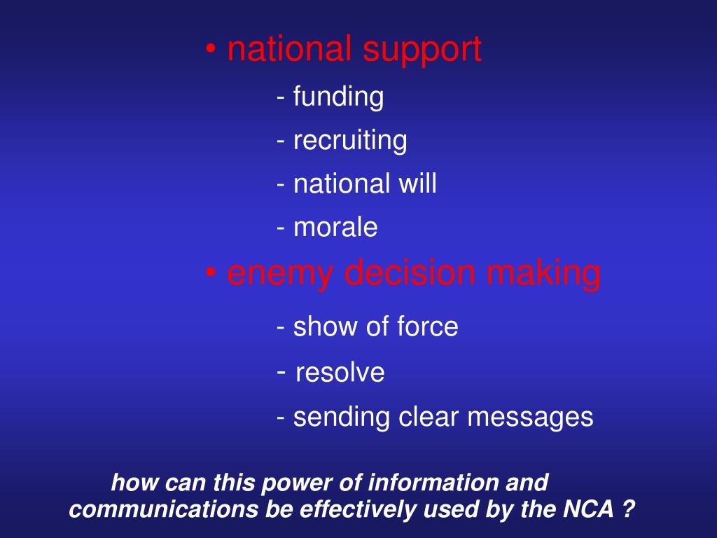 national support • - funding • - recruiting • - national will • - morale • enemy decision making • - show of force • - resolve • - sending clear messages • how can this power of information and • communications be effectively used by the NCA ?