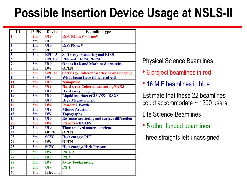 Possible Insertion Device Usage at NSLS-II • Physical Science Beamlines • 6 project beamlines in red • 16 MIE beamlines in blue • Estimate that these 22 beamlines could accommodate ~ 1300 users • Life Science Beamlines • 5 other funded beamlines • Three straights left unassigned