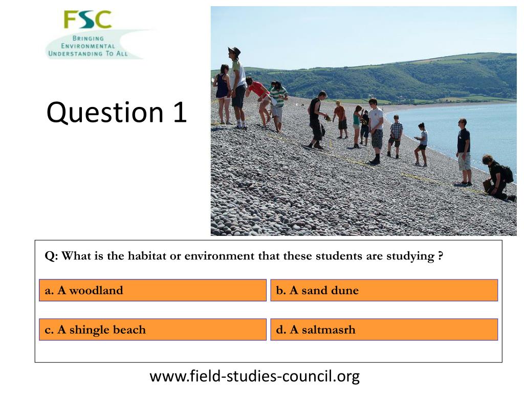 Question 1 Q: What is the habitat or environment that these students are studying ? a. Coastal sand dunes a. A woodland b. A sand dune c. A shingle beach d. A saltmasrh www.field-studies-council.org