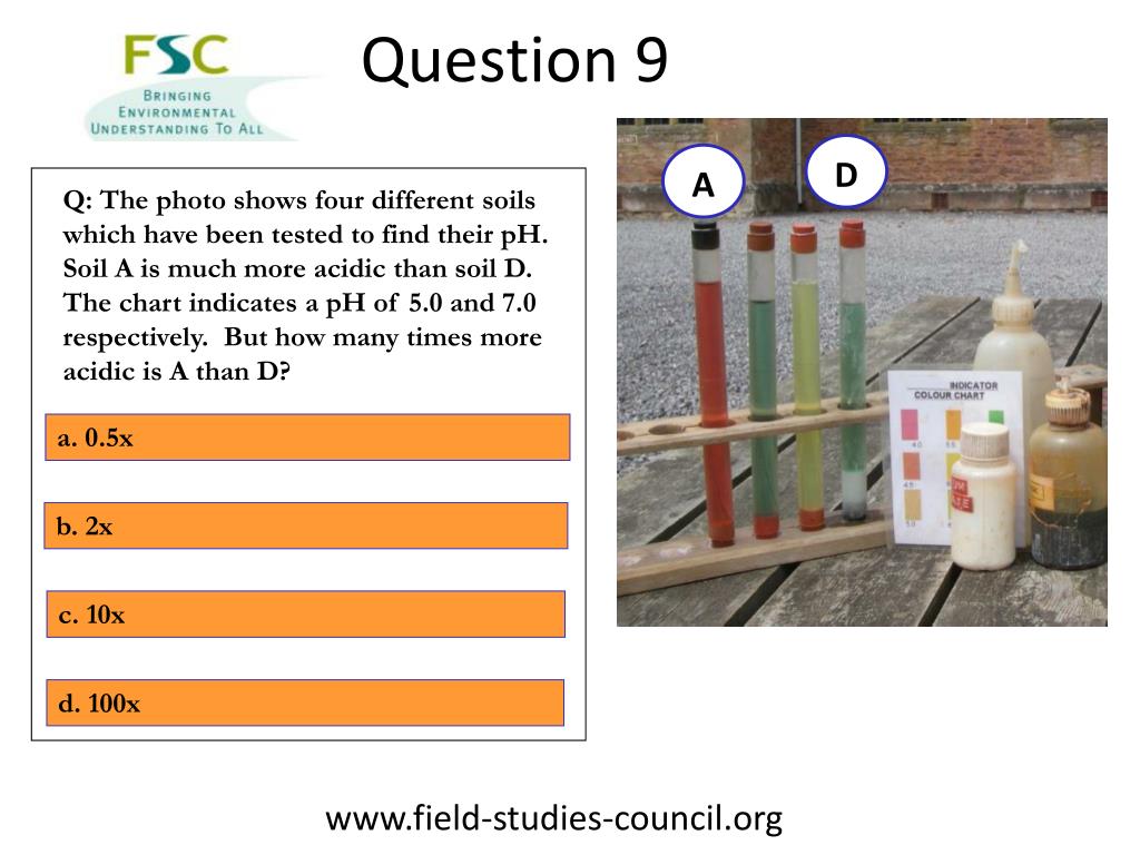 Question 9 D A Q: The photo shows four different soils which have been tested to find their pH. Soil A is much more acidic than soil D. The chart indicates a pH of 5.0 and 7.0 respectively. But how many times more acidic is A than D? a. 0.5x b. 2x c. 10x d. 100x www.field-studies-council.org