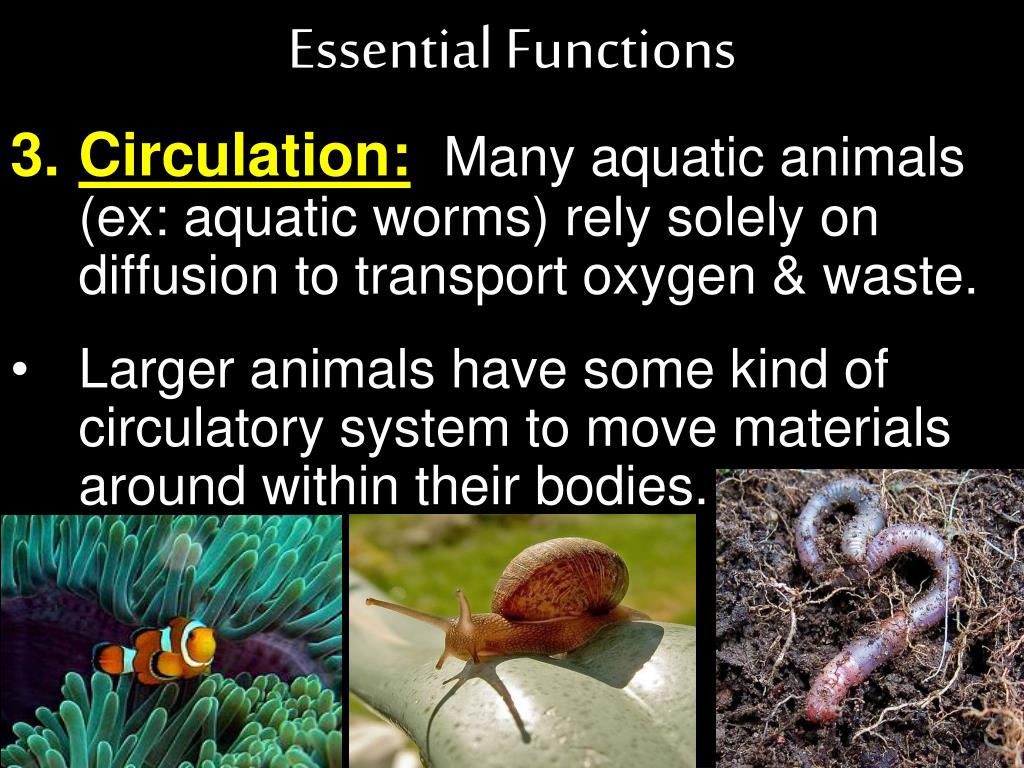Essential Functions Circulation:Many aquatic animals (ex: aquatic worms) rely solely on diffusion to transport oxygen & waste. Larger animals have some kind of circulatory system to move materials around within their bodies.