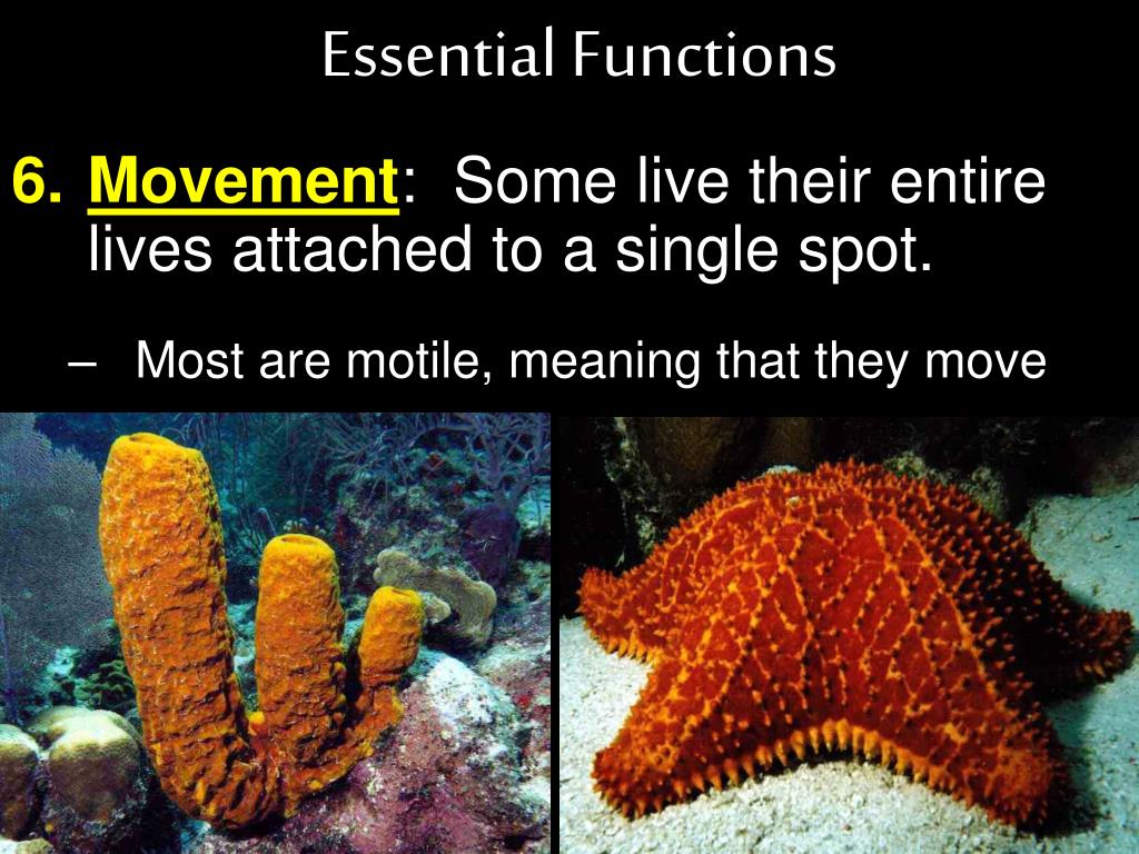 Essential Functions Movement: Some live their entire lives attached to a single spot. Most are motile, meaning that they move