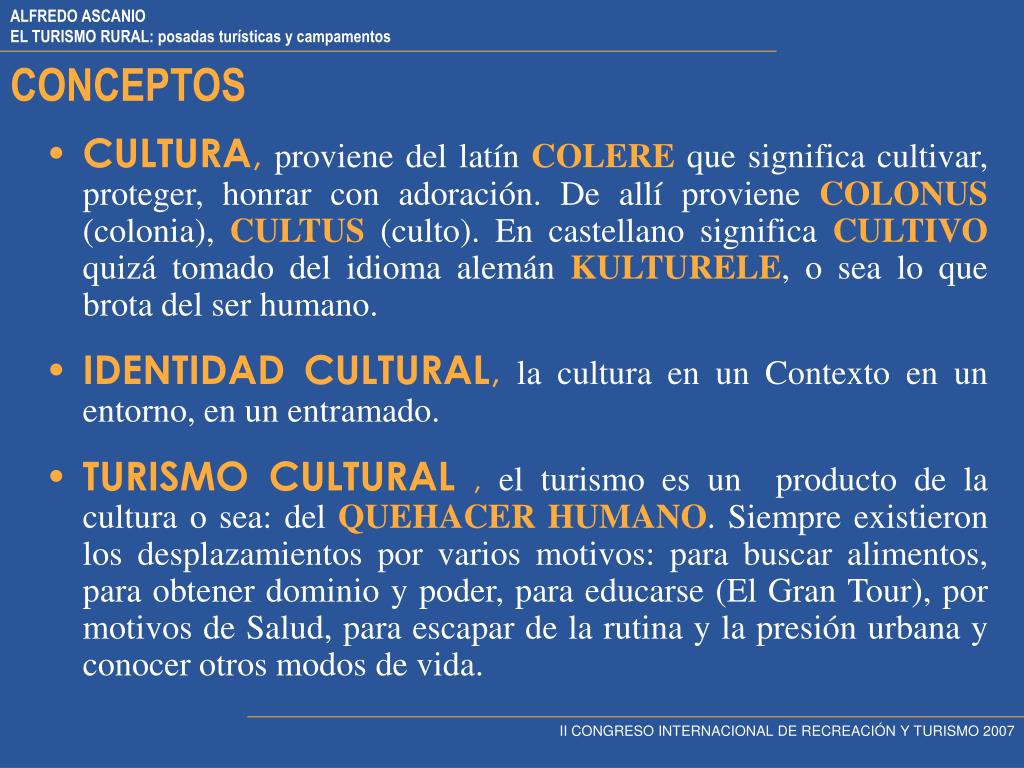 CONCEPTOS • CULTURA,proviene del latín COLEREque significa cultivar, proteger, honrar con adoración. De allí proviene COLONUS (colonia), CULTUS(culto). En castellano significaCULTIVO quizá tomado del idioma alemán KULTURELE, o sea lo que brota del ser humano. • IDENTIDAD CULTURAL,la cultura en un Contexto en un entorno, en un entramado. • TURISMO CULTURAL ,el turismo es un producto de la cultura o sea: del QUEHACER HUMANO. Siempre existieron los desplazamientos por varios motivos: para buscar alimentos, para obtener dominio y poder, para educarse (El Gran Tour), por motivos de Salud, para escapar de la rutina y la presión urbana y conocer otros modos de vida. II CONGRESO INTERNACIONAL DE RECREACIÓN Y TURISMO 2007