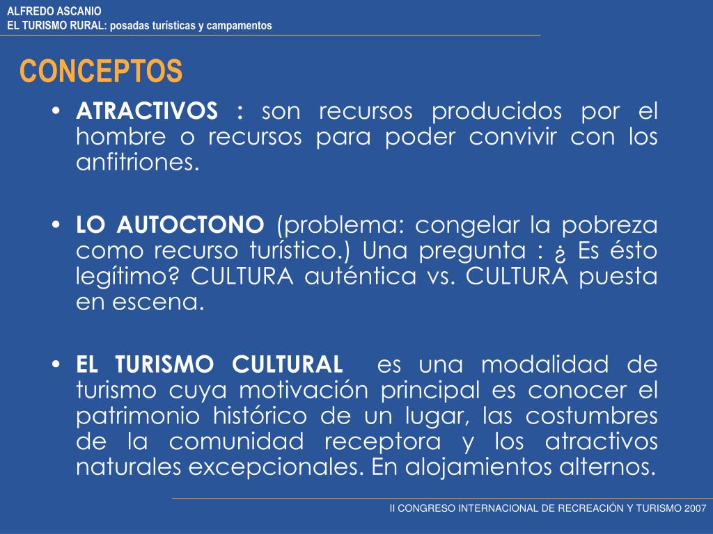 CONCEPTOS • ATRACTIVOS : son recursos producidos por el hombre o recursos para poder convivir con los anfitriones. • LO AUTOCTONO (problema: congelar la pobreza como recurso turístico.) Una pregunta : ¿ Es ésto legítimo? CULTURA auténtica vs. CULTURA puesta en escena. • EL TURISMO CULTURAL es una modalidad de turismo cuya motivación principal es conocer el patrimonio histórico de un lugar, las costumbres de la comunidad receptora y los atractivos naturales excepcionales. En alojamientos alternos. II CONGRESO INTERNACIONAL DE RECREACIÓN Y TURISMO 2007