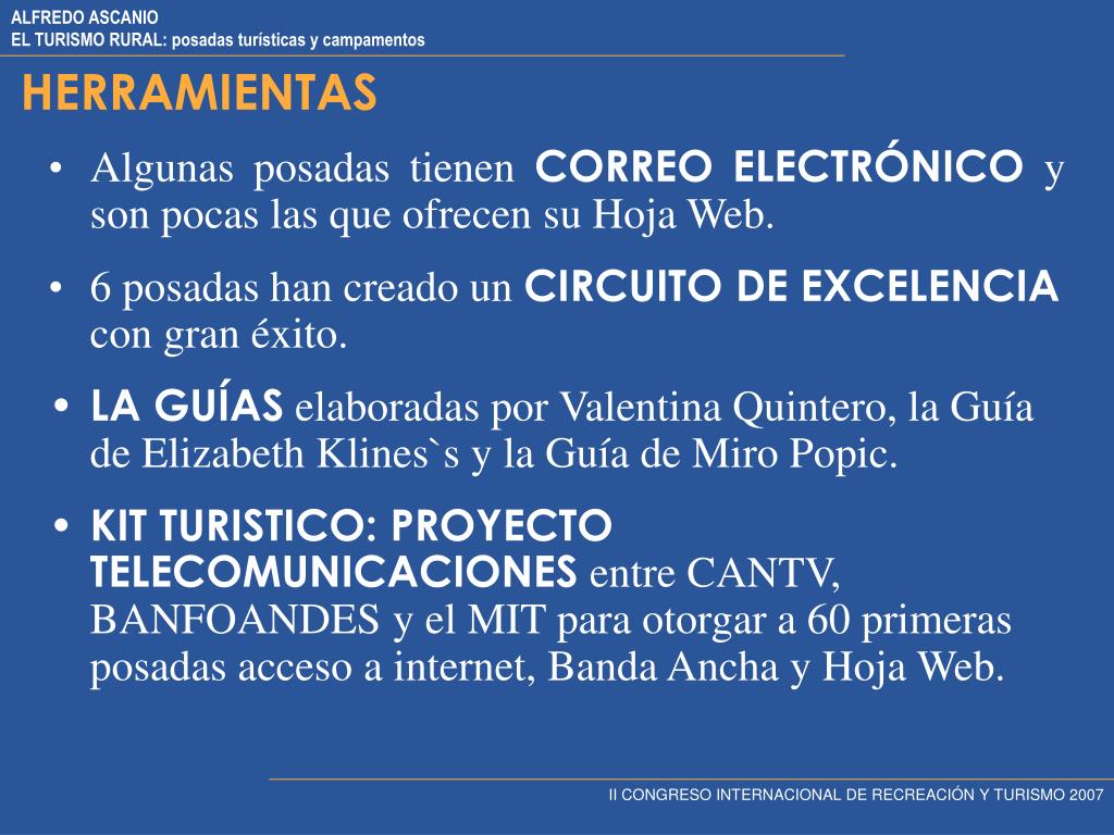 HERRAMIENTAS • Algunas posadas tienen CORREO ELECTRÓNICO y son pocas las que ofrecen su Hoja Web. • 6 posadas han creado un CIRCUITO DE EXCELENCIA con gran éxito. • LA GUÍAS elaboradas por Valentina Quintero, la Guía de Elizabeth Klines`s y la Guía de Miro Popic. • KIT TURISTICO: PROYECTO TELECOMUNICACIONES entre CANTV, BANFOANDES y el MIT para otorgar a 60 primeras posadas acceso a internet, Banda Ancha y Hoja Web. II CONGRESO INTERNACIONAL DE RECREACIÓN Y TURISMO 2007