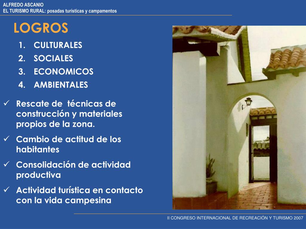 LOGROS CULTURALES SOCIALES ECONOMICOS AMBIENTALES • Rescate de técnicas de construcción y materiales propios de la zona. • Cambio de actitud de los habitantes • Consolidación de actividad productiva • Actividad turística en contacto con la vida campesina II CONGRESO INTERNACIONAL DE RECREACIÓN Y TURISMO 2007
