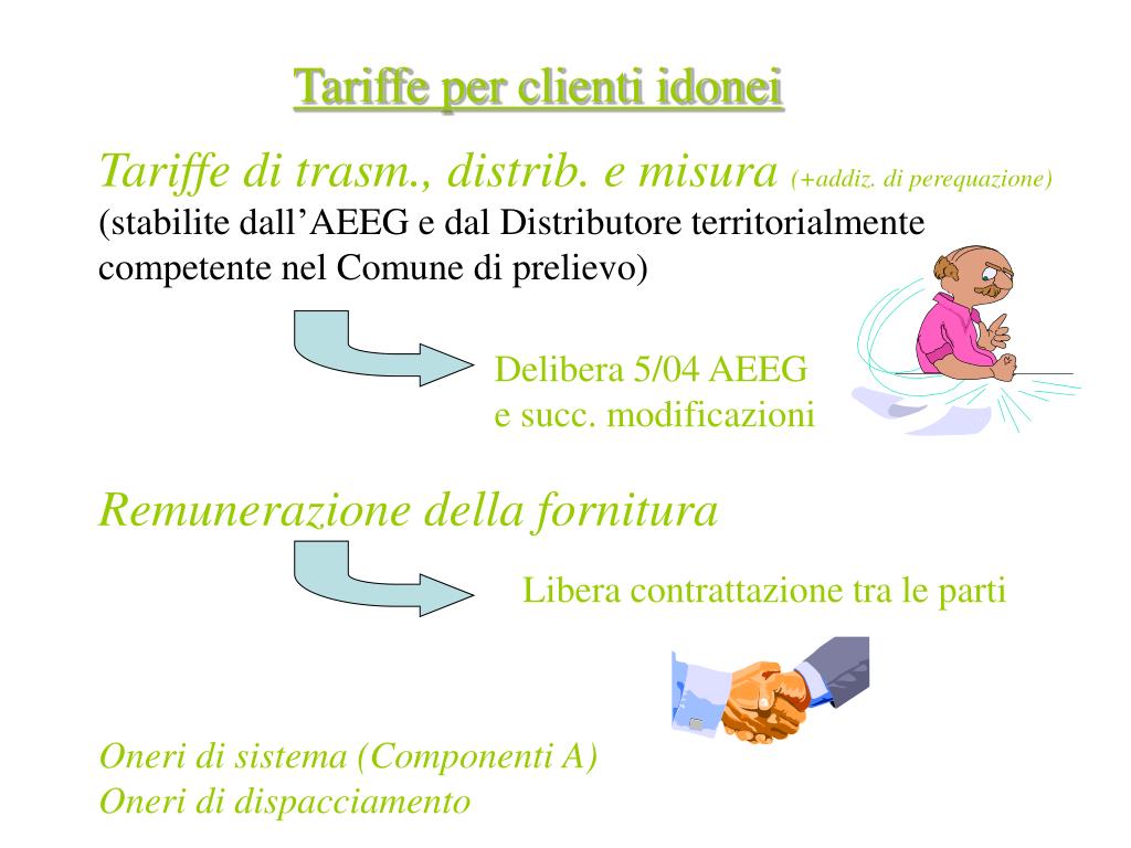 Delibera 5/04 AEEG e succ. modificazioni Libera contrattazione tra le parti Tariffe per clienti idonei Tariffe di trasm., distrib. e misura (+addiz. di perequazione)(stabilite dall’AEEG e dal Distributore territorialmente competente nel Comune di prelievo) Remunerazione della fornitura Oneri di sistema (Componenti A) Oneri di dispacciamento