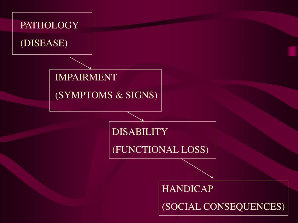 PATHOLOGY (DISEASE) IMPAIRMENT (SYMPTOMS & SIGNS) DISABILITY (FUNCTIONAL LOSS) HANDICAP (SOCIAL CONSEQUENCES)