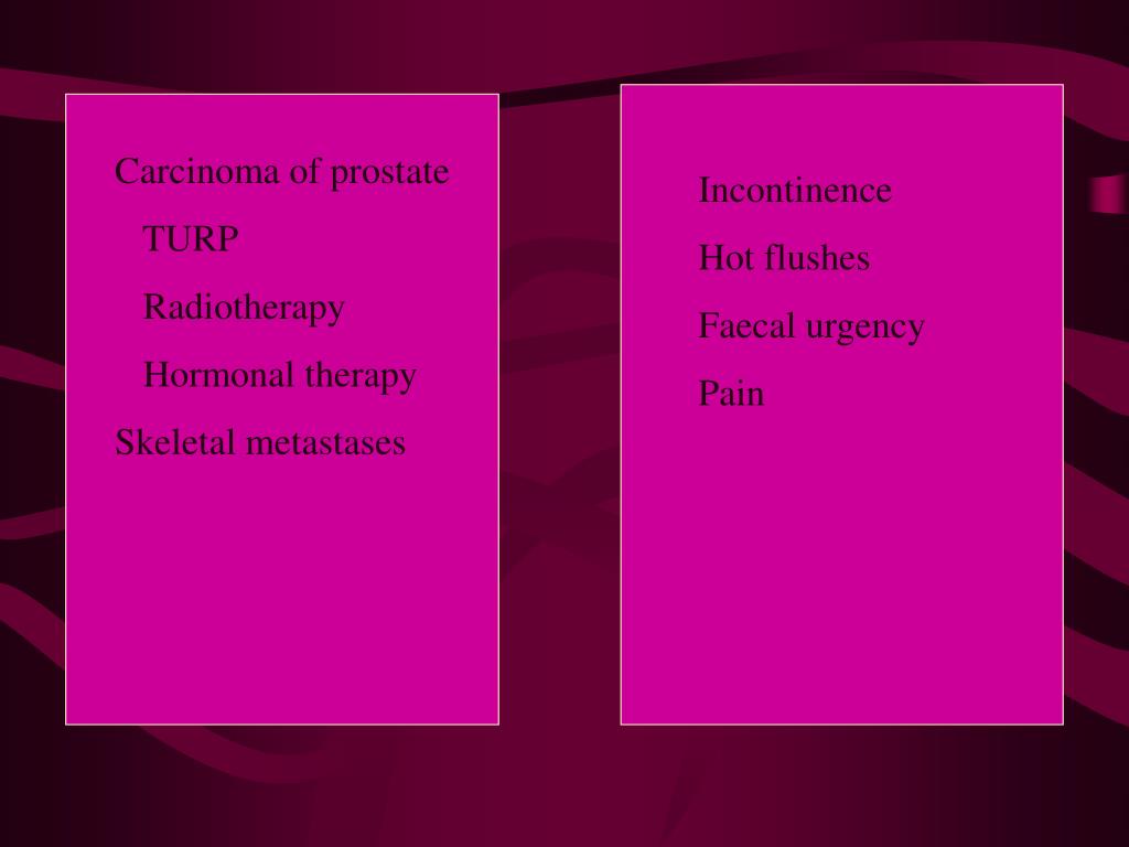 Carcinoma of prostate TURP Radiotherapy Hormonal therapy Skeletal metastases Incontinence Hot flushes Faecal urgency Pain