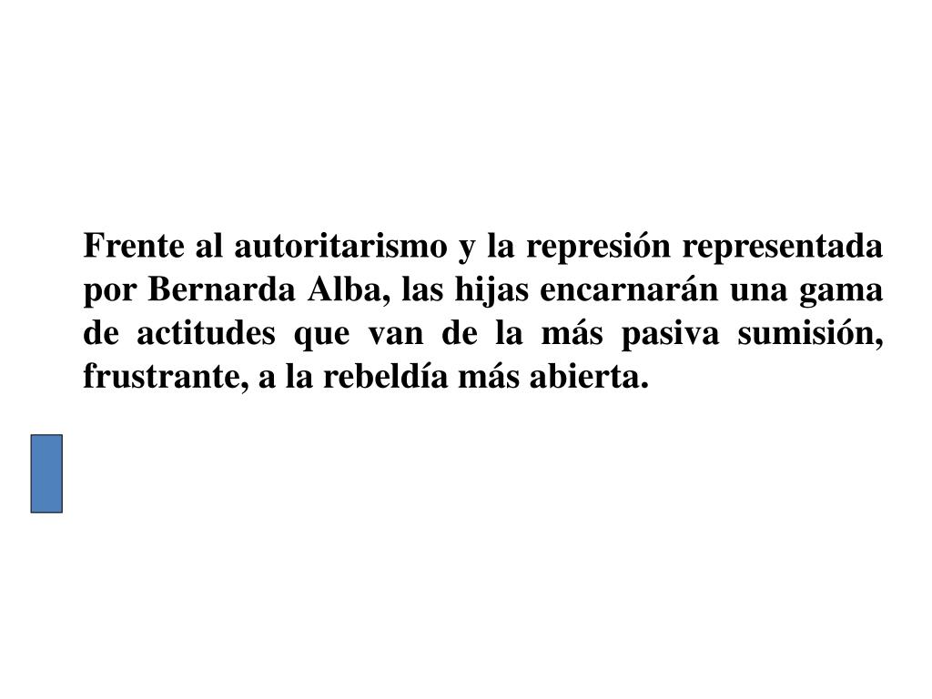 Frente al autoritarismo y la represión representada por Bernarda Alba, las hijas encarnarán una gama de actitudes que van de la más pasiva sumisión, frustrante, a la rebeldía más abierta.