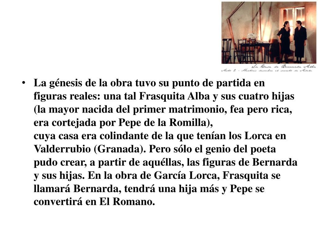 La génesis de la obra tuvo su punto de partida en figuras reales: una tal Frasquita Alba y sus cuatro hijas (la mayor nacida del primer matrimonio, fea pero rica, era cortejada por Pepe de la Romilla),cuya casa era colindante de la que tenían los Lorca en Valderrubio (Granada). Pero sólo el genio del poeta pudo crear, a partir de aquéllas, las figuras de Bernarda y sus hijas. En la obra de García Lorca, Frasquita se llamará Bernarda, tendrá una hija más y Pepe se convertirá en El Romano.