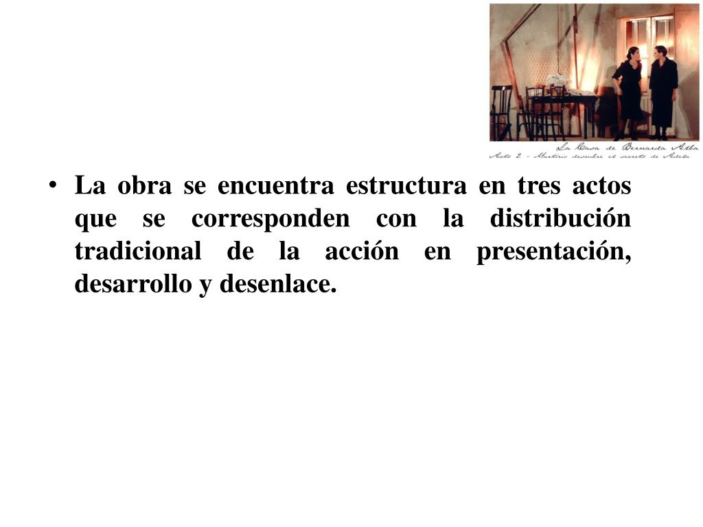 La obra se encuentra estructura en tres actos que se corresponden con la distribución tradicional de la acción en presentación, desarrollo y desenlace.