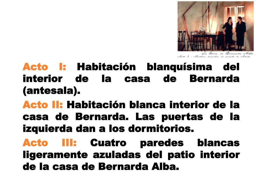 Acto I: Habitación blanquísima del interior de la casa de Bernarda (antesala). Acto II: Habitación blanca interior de la casa de Bernarda. Las puertas de la izquierda dan a los dormitorios. Acto III: Cuatro paredes blancas ligeramente azuladas del patio interior de la casa de Bernarda Alba.