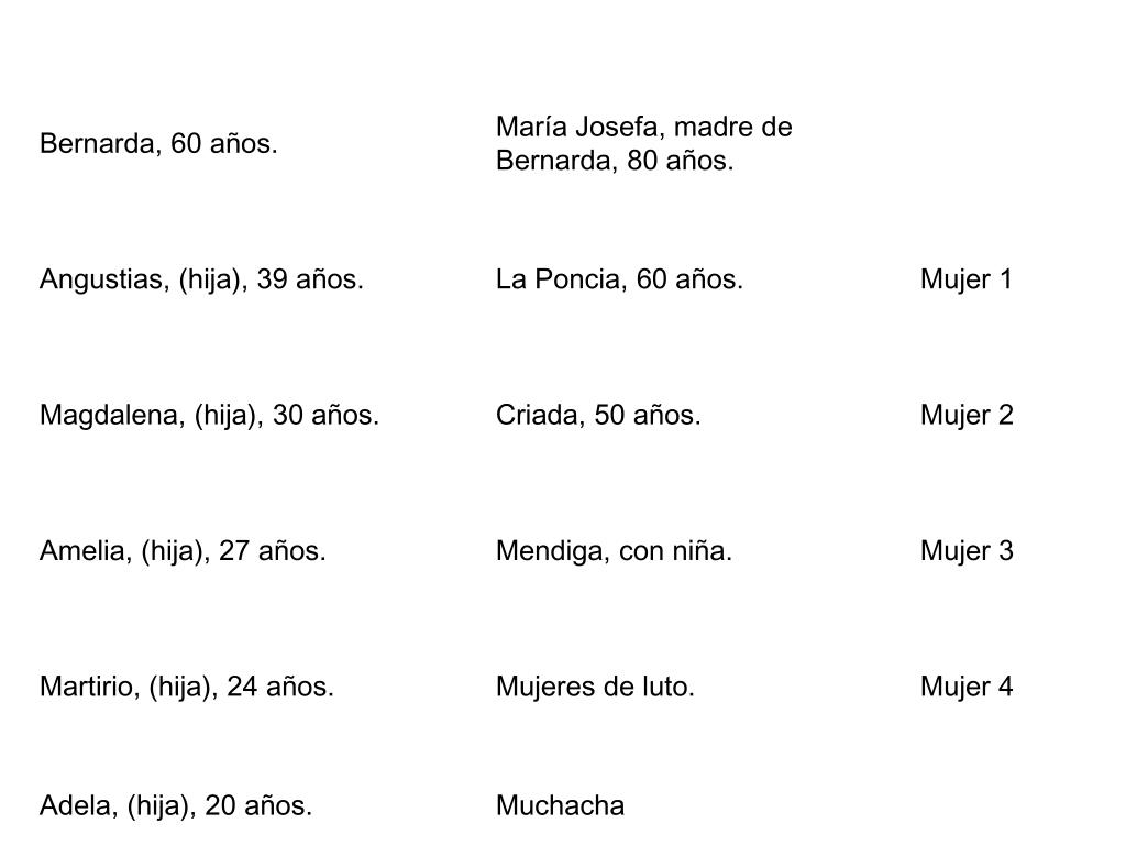 Bernarda, 60 años. María Josefa, madre de Bernarda, 80 años. Angustias, (hija), 39 años. La Poncia, 60 años. Mujer 1 Magdalena, (hija), 30 años. Criada, 50 años. Mujer 2 Amelia, (hija), 27 años. Mendiga, con niña. Mujer 3 Martirio, (hija), 24 años. Mujeres de luto. Mujer 4 Adela, (hija), 20 años. Muchacha