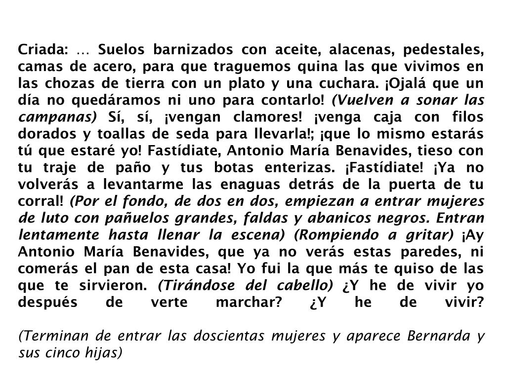 Criada: … Suelos barnizados con aceite, alacenas, pedestales, camas de acero, para que traguemos quina las que vivimos en las chozas de tierra con un plato y una cuchara. ¡Ojalá que un día no quedáramos ni uno para contarlo! (Vuelven a sonar las campanas) Sí, sí, ¡vengan clamores! ¡venga caja con filos dorados y toallas de seda para llevarla!; ¡que lo mismo estarás tú que estaré yo! Fastídiate, Antonio María Benavides, tieso con tu traje de paño y tus botas enterizas. ¡Fastídiate! ¡Ya no volverás a levantarme las enaguas detrás de la puerta de tu corral! (Por el fondo, de dos en dos, empiezan a entrar mujeres de luto con pañuelos grandes, faldas y abanicos negros. Entran lentamente hasta llenar la escena) (Rompiendo a gritar) ¡Ay Antonio María Benavides, que ya no verás estas paredes, ni comerás el pan de esta casa! Yo fui la que más te quiso de las que te sirvieron. (Tirándose del cabello) ¿Y he de vivir yo después de verte marchar? ¿Y he de vivir?(Terminan de entrar las doscientas mujeres y aparece Bernarda y sus cinco hijas)