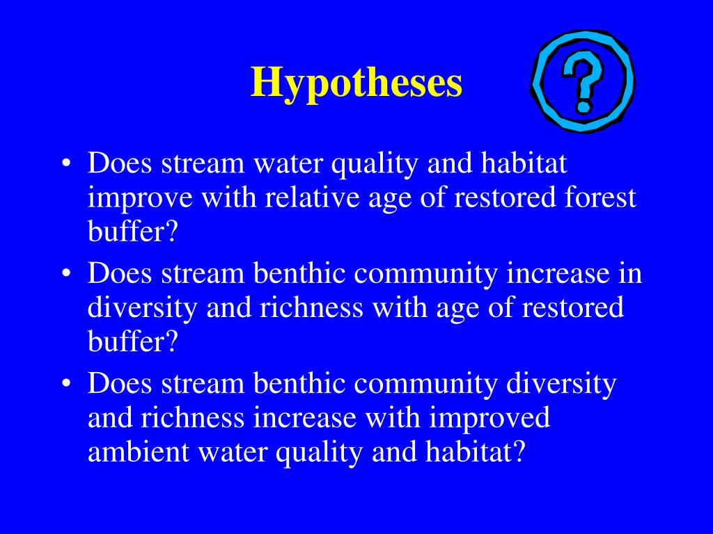 Hypotheses • Does stream water quality and habitat improve with relative age of restored forest buffer? • Does stream benthic community increase in diversity and richness with age of restored buffer? • Does stream benthic community diversity and richness increase with improved ambient water quality and habitat?