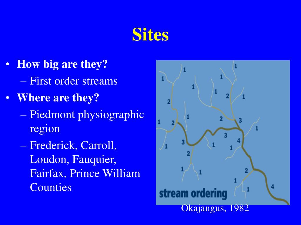 Sites • How big are they? • First order streams • Where are they? • Piedmont physiographic region • Frederick, Carroll, Loudon, Fauquier, Fairfax, Prince William Counties Okajangus, 1982