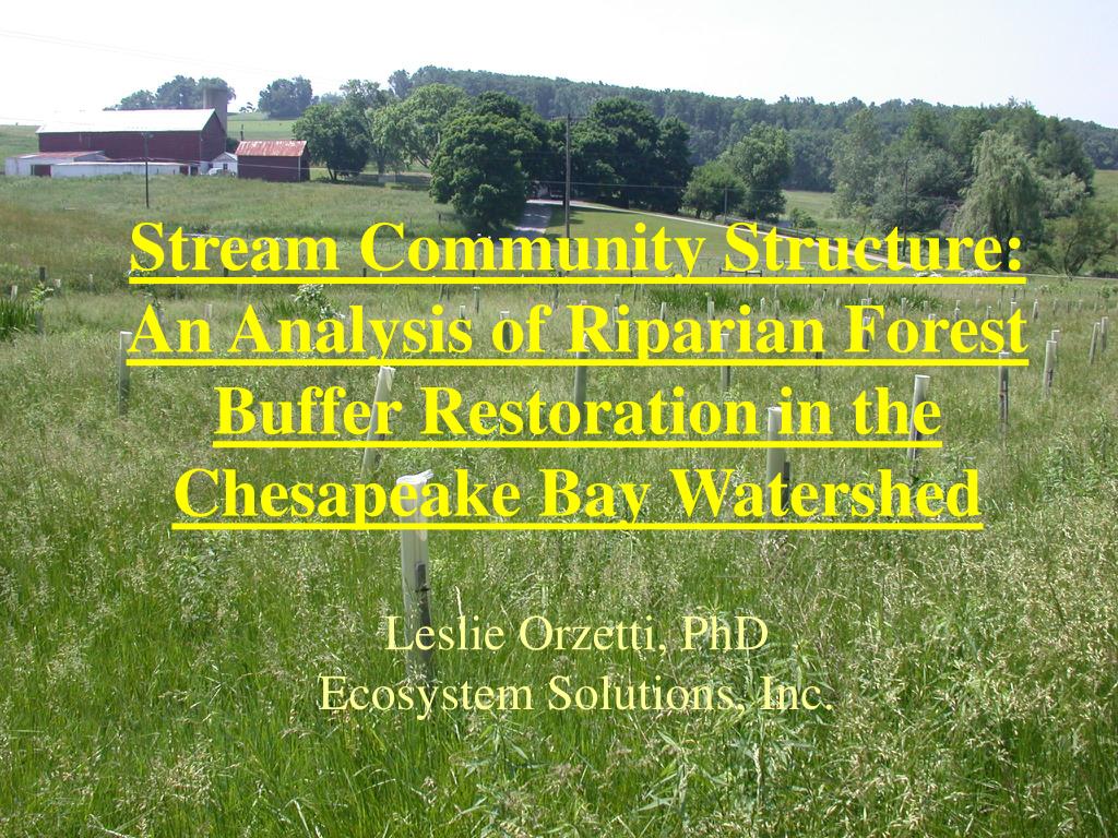 Stream Community Structure: An Analysis of Riparian Forest Buffer Restoration in the Chesapeake Bay Watershed Leslie Orzetti, PhD Ecosystem Solutions, Inc.